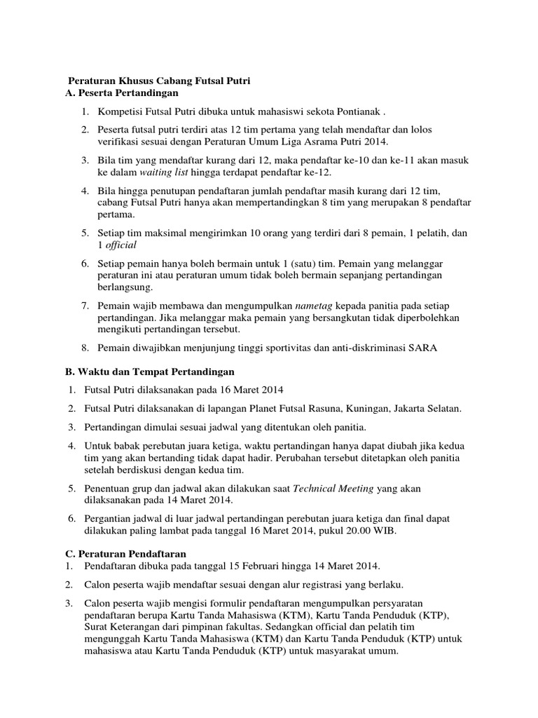 Peraturan Khusus Cabang Futsal Putri Pdf